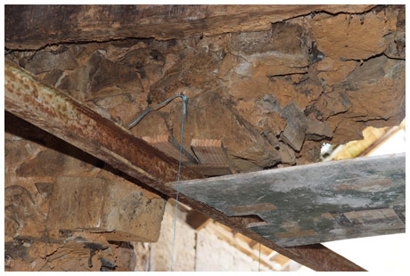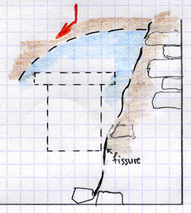 Une analyse de l'état du mur s'impose, surtout lorsque des fissures sont présentes. Dans le cas ci-après, la présence de la fissure à droite va faire que l'arc de décharge naturel sera déporté vers la fissure.