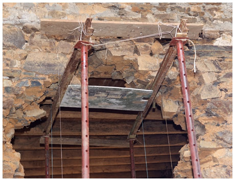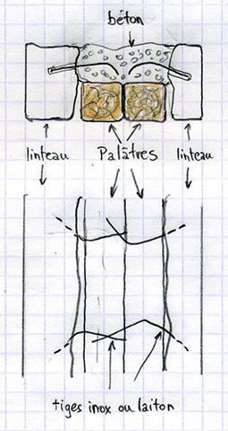 Dans le cas d'un mur fragile, les 2 linteaux peuvent être solidarisés dans l'épaisseur du mur. Les linteaux sont alors percés en biais et des barres d'acier inox ou de laiton sont insérées et recourbées ensuite pour se croiser dans un béton au dessus des palâtres.