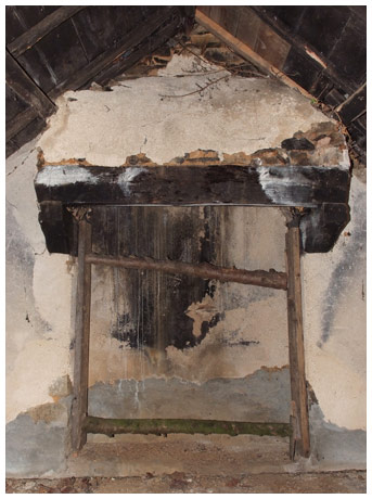 Lorsque le mur à ouvrir comporte d'autres ouvertures, il faut impérativement les renforcer, comme ici (image ci-dessous) ce foyer de cheminée situé juste au dessus d'une ouverture en cours de réalisation.