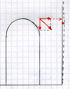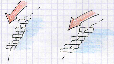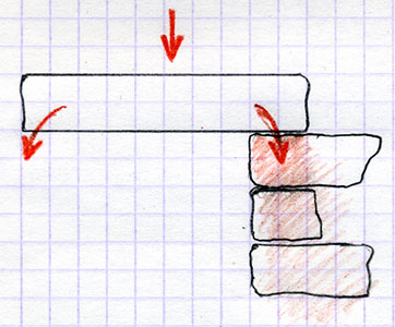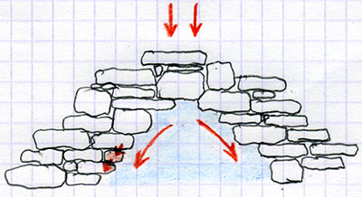 On voit ici que l'on affaire à un système en charge et stable, à priori !... car si la petite pierre rouge à gauche s'échappe, pour une raison ou pour une autre (vous la bousculez en passant trop près...) eh bien vous pouvez être sûr que tout s'écroule ! Tout ? non, car se recréera, plus haut, plus large, un autre arc de décharge. En attendant, il pourra y avoir du dégat, humain et matériel. Ne vous amusez donc pas à « jouer » avec ce concept pour vous éviter d'étayer, le jeu n'en vaut vraiment la chandelle et de toutes façons, cela vous génèrera un surcroît de travail car vous aurez plus de mur à remonter...