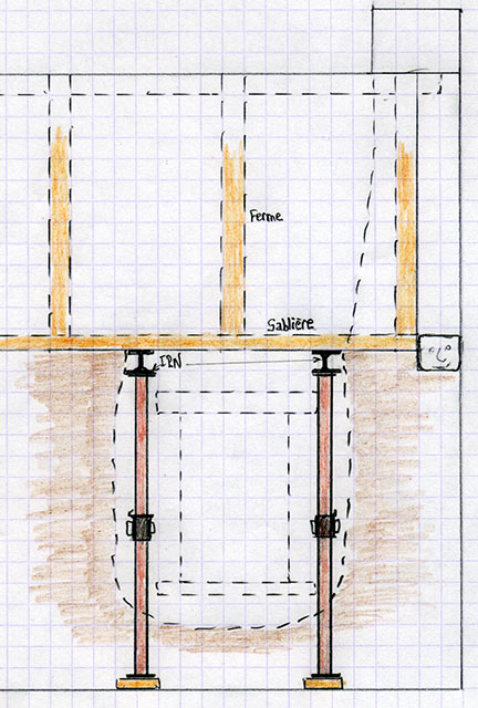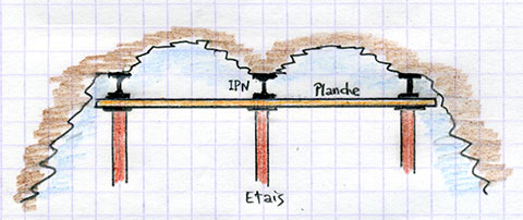 Dans le croquis ci-dessus, on a figuré 3 poutrelles IPN supportées par 3 rangées d'étais, situées sensiblement au dessus de l'arc à réaliser.
