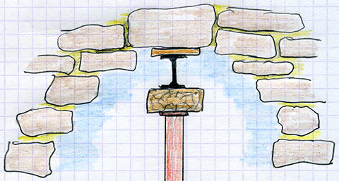 Si votre ouverture est large, alors il faut augmenter le nombre de rangées d'étais. Un petit arc de décharge se créera donc entre chaque rangée d'étais, comme ici dans ce croquis :