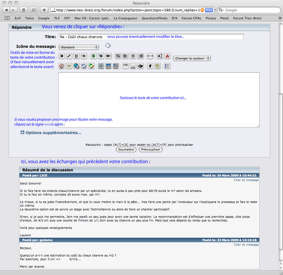 Les échanges précédents s'affichent, en dessous la fenêtre de saisie de votre message de contribution.