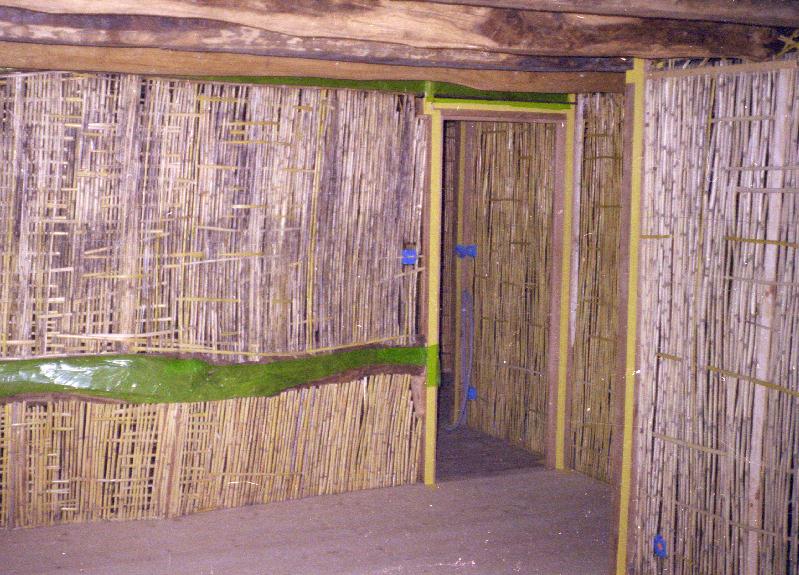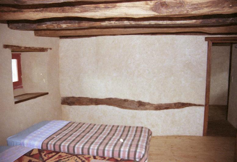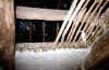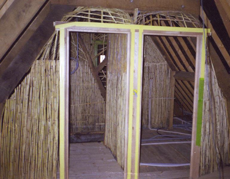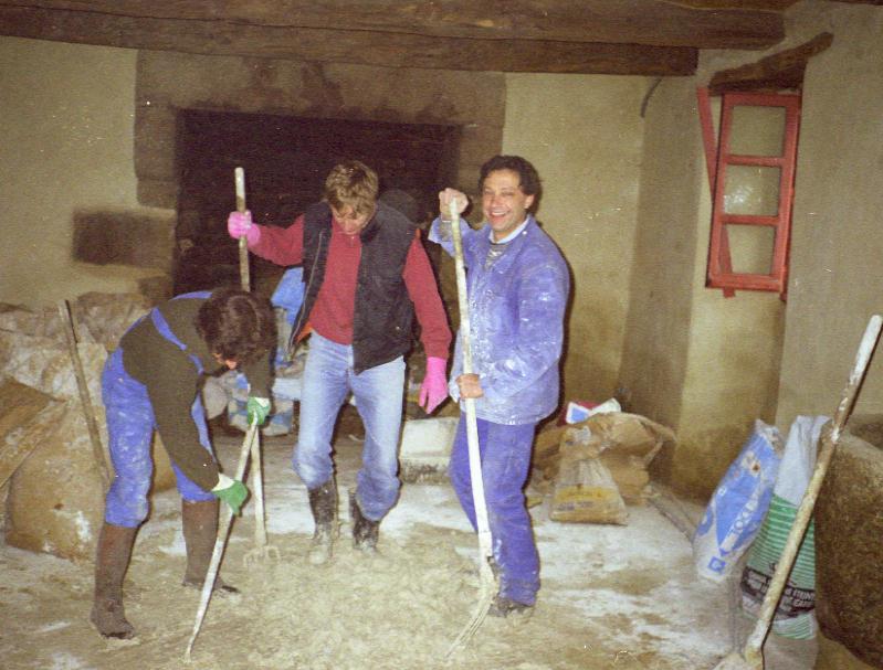 | Préparation du mortier de chanvre et chaux, foulé aux pieds (la nature filandreuse du chanvre utilisé ne permet pas le passage en bétonnière) : |